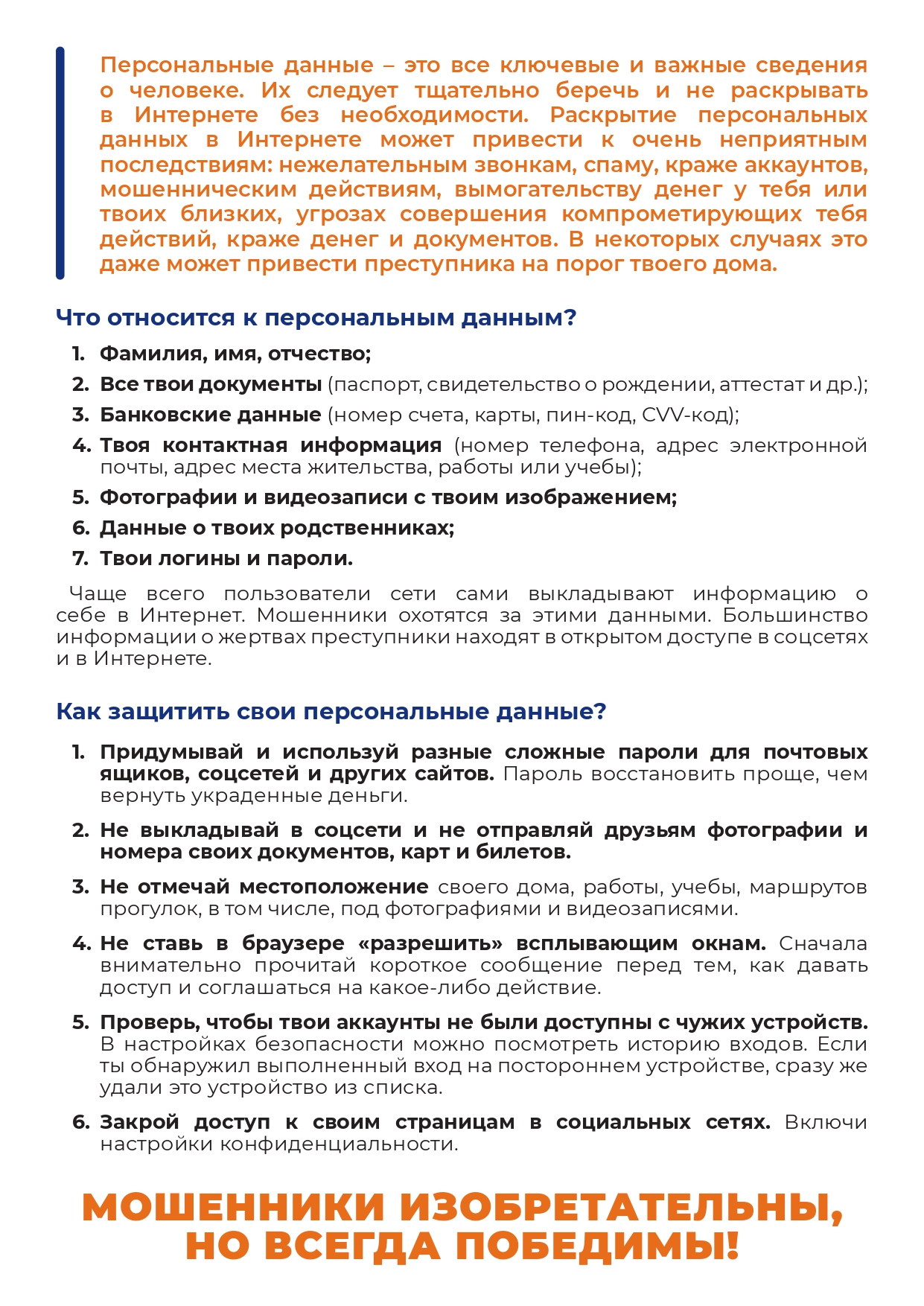 Защищай свою частную жизнь. Не указывай пароли, телефоны, адреса, дату твоего рождения и другую личную информацию. Злоумышленники могут использовать даже информацию о том, как ты и твои родители планируете провести каникулы;